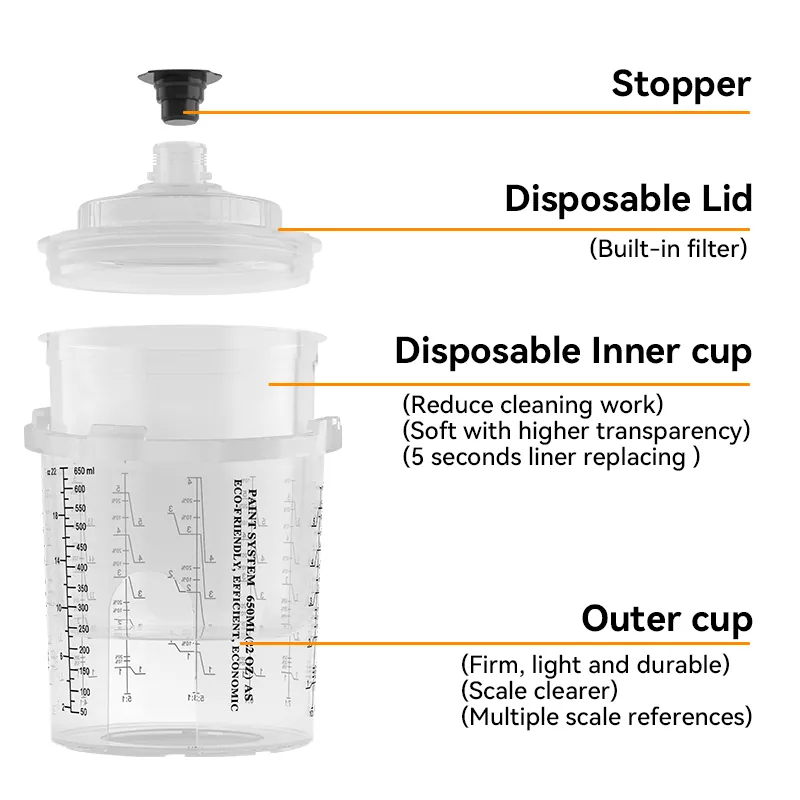 200 এমএল ডিসপোজেবল স্প্রে কাপ একটি ডিসপোজেবল পেইন্ট কাপ সিস্টেম যা 1-প্যানেল মেরামতের জন্য ডিজাইন করা হয়েছে, এটি 6.8 এফএল ওজেড (200 এমএল) বা কম উপাদানগুলির জন্য উপযুক্ত t এটি এআইএস 1.0 সিরিজের উপর ভিত্তি করে বাইরের কাপের নকশা আপগ্রেড করেছে। ইন্টিগ্রেটেড আউটার কাপ লকটি কলার অংশগুলি ছাড়াই করে, যা স্প্রে কাপের সমাবেশ এবং বিচ্ছিন্ন করা সহজ করে তোলে; AYS3.1 সিরিজ পেইন্ট কাপ সিস্টেম হ'ল আইসপ্যাটের নিউস্ট ডিসপোজেবল স্প্রে গান কাপ, যা পেইন্ট মিক্সিং, স্প্রেিং এবং স্টোরেজের পুরো প্রক্রিয়াটির দক্ষতা এবং গুণমানকে উল্লেখযোগ্যভাবে উন্নত করে।