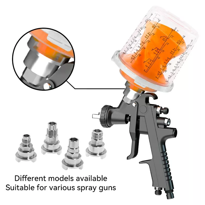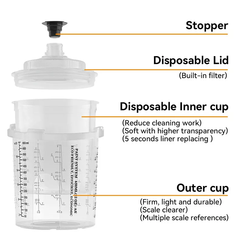 - স্প্রে কাপের ভিতরের লাইনার নরম, স্বচ্ছ, খাদ্য-গ্রেড PE উপাদান দিয়ে তৈরি। এটি স্প্রে করার সময় নিচের দিকে সর্পিল হয়, যা পেইন্টের অবশিষ্টাংশকে কমিয়ে দেয়।
